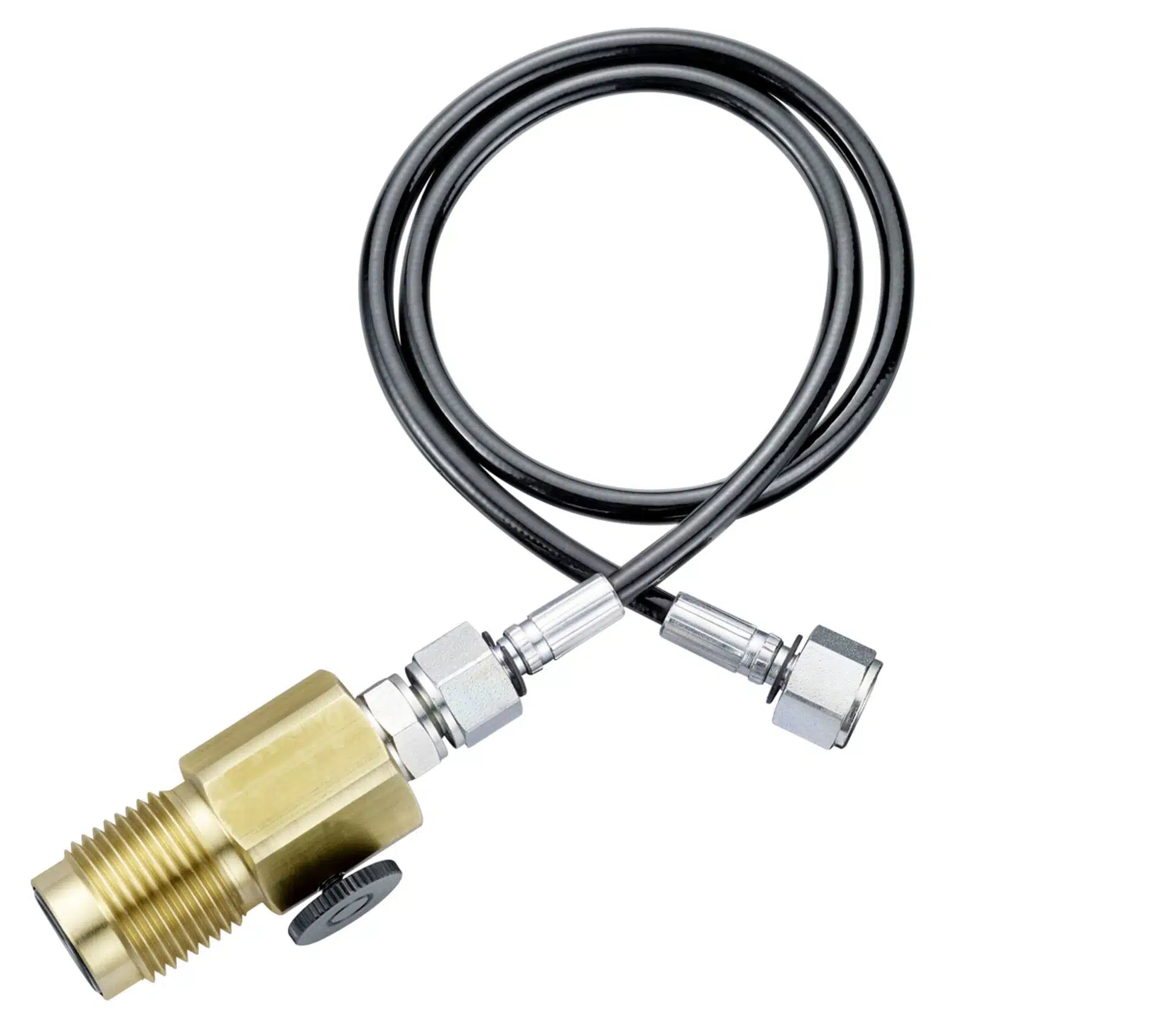 Hadice je vybavena konektorem DIN (G5/8) pro snadné našroubování na láhev a odpouštěcím ventilem, který umožňuje uvolnění přebytečného tlaku po dokončení plnění.