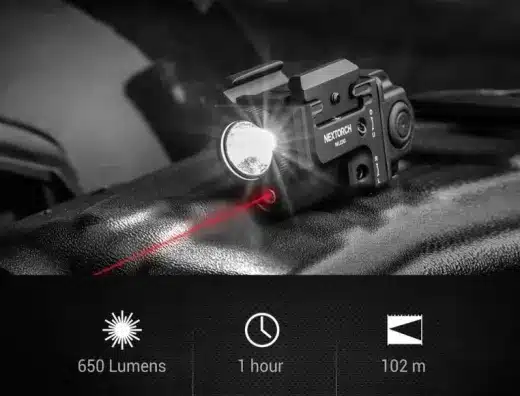 Kvalitní a praktická LED svítilna WL22G s červeným laserem od firmy NEXTORCH pro ruční střelné zbraně. Jednoduchá montáž a ovládání jednou rukou. Výkon 650 lm a dosvit až 102 m.